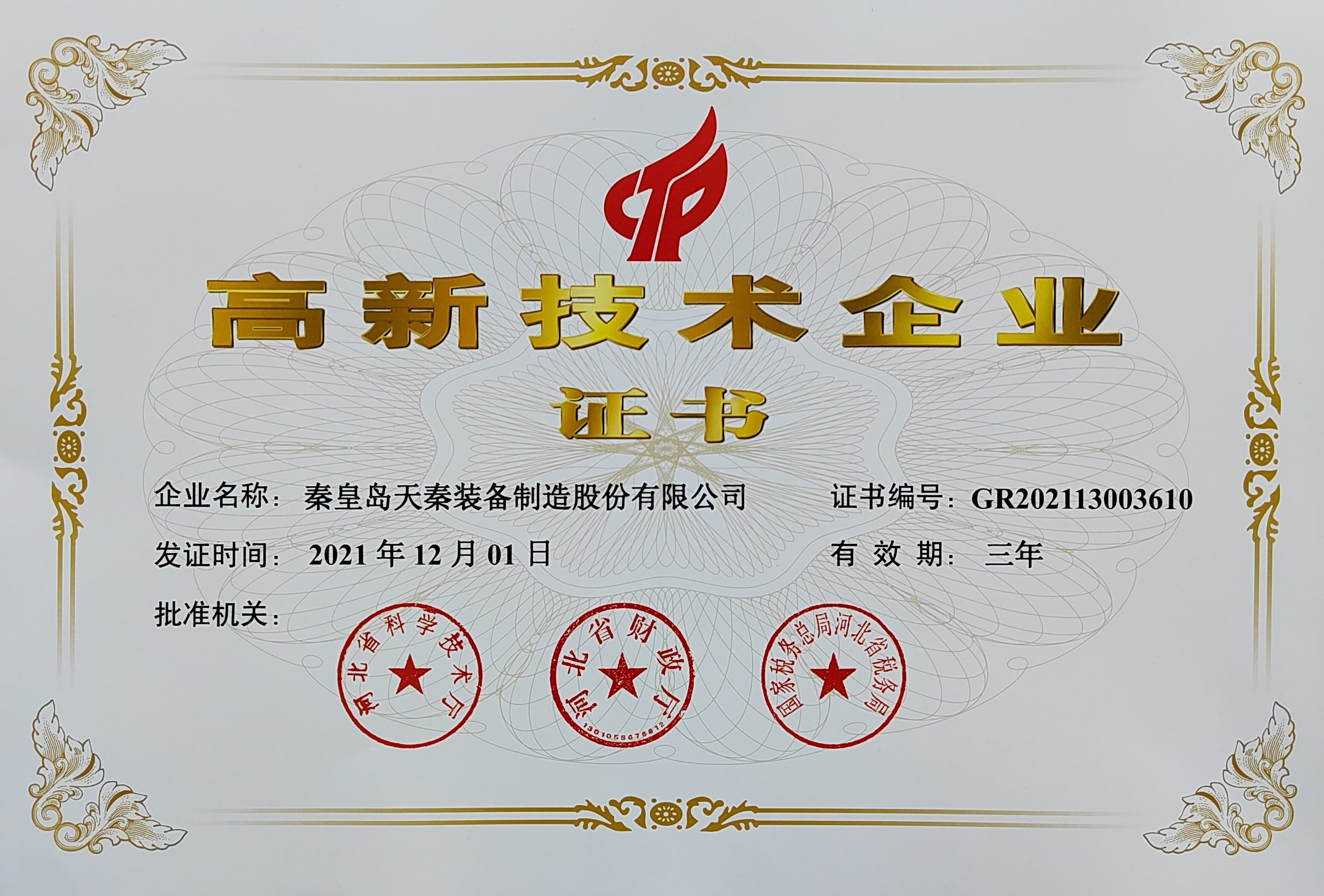 - 秦皇島天秦裝備制造股份有限公司創(chuàng)立于1996年,總部位于河北省秦皇島市經(jīng)濟技術開發(fā)區(qū),秦皇島廠區(qū)占地4萬平方米,擁有3萬平方米的標準廠房、辦公樓和工程技術研發(fā)中心;分部天津廠區(qū)位于天津市靜海經(jīng)濟開發(fā)區(qū),占地2萬平方米,擁有1.6萬平方米標準廠房。 公司通過了GB/T 19001質(zhì)量管理體系及GB/T 24001環(huán)境管理體系認證,是國家高新技術企業(yè)、河北省軍民融合產(chǎn)學研用創(chuàng)建基地,建有省級院士工作站。
